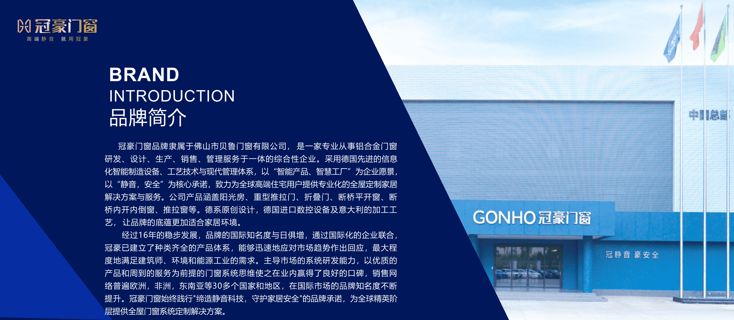 冠豪门窗品牌隶属于佛山市贝鲁门窗有限公司,是一家专业从事铝合金门窗研发、设计、生产、销售、管理服务于一体的综合性企业。公司产品涵盖平开窗,推拉窗,平开门,推拉门,阳光房等。德系原创设计,德国进口数控设备及意大利的加工工艺,让品牌的底蕴更加适合家居环境。经过多年的稳步发展,品牌的国际知名度与日俱增,通过国际化的企业联合,冠豪已建立了种类齐全的产品体系,能够迅速地应对市场趋势作出回应,最大程度地满足建筑师、环境和能源工业的需求。主导市场的系统研发能力,以优产品和周到的服务为前提的门窗系统思维使之在业内赢得了良好的口碑销售网络遍布欧洲,非洲,东南亚等 30多个国家和地区,在国际市场的品牌知名度不断提升。